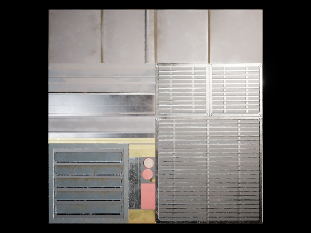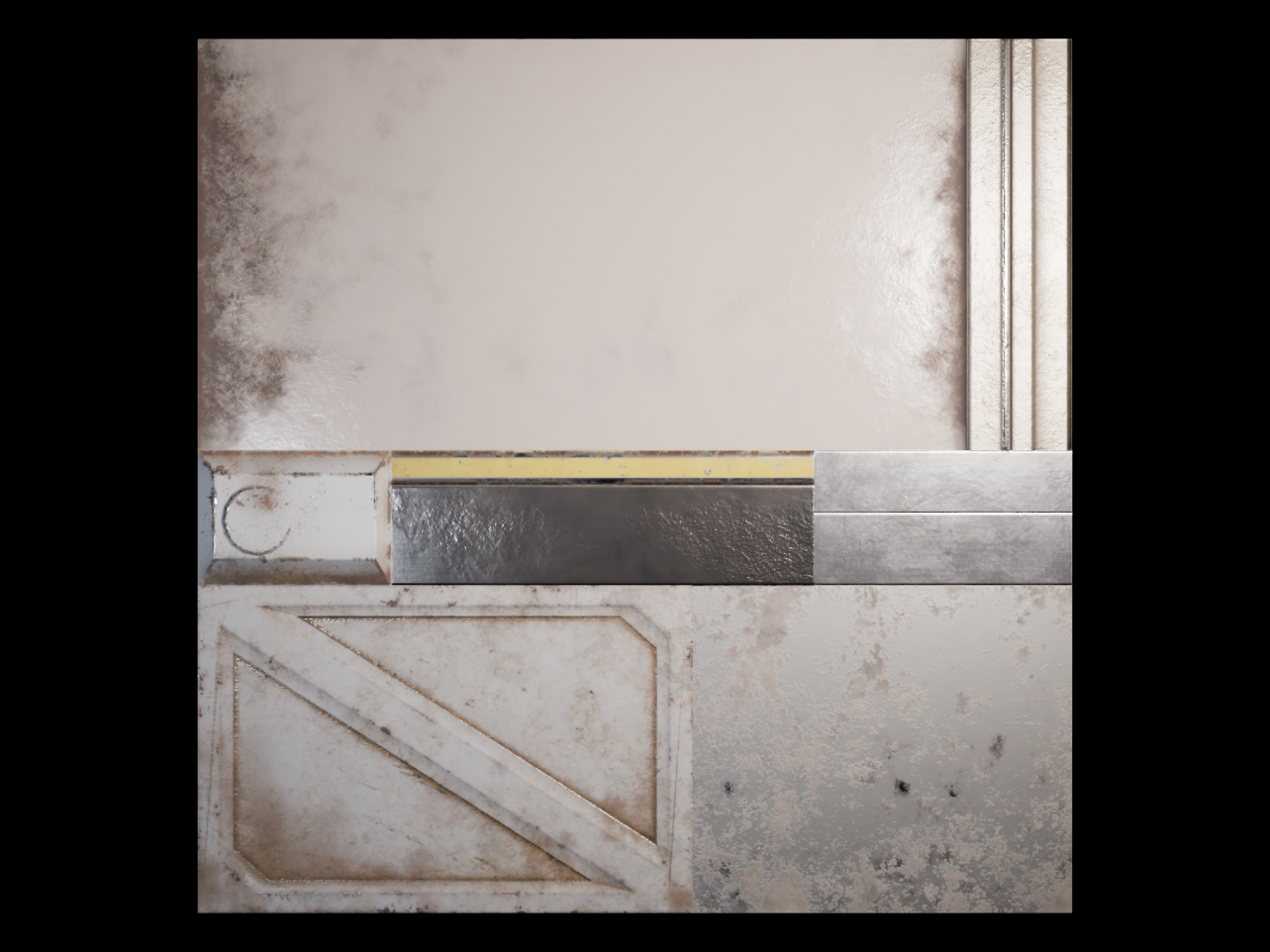 RGB masking was used to avoid having unique high-res textures around the scene. Including the trim sheets, almost the entire scene is made using only 5 textures. The 3 tileable textures below, made in Substance Designer, covers most assets that don't use the trim sheets.