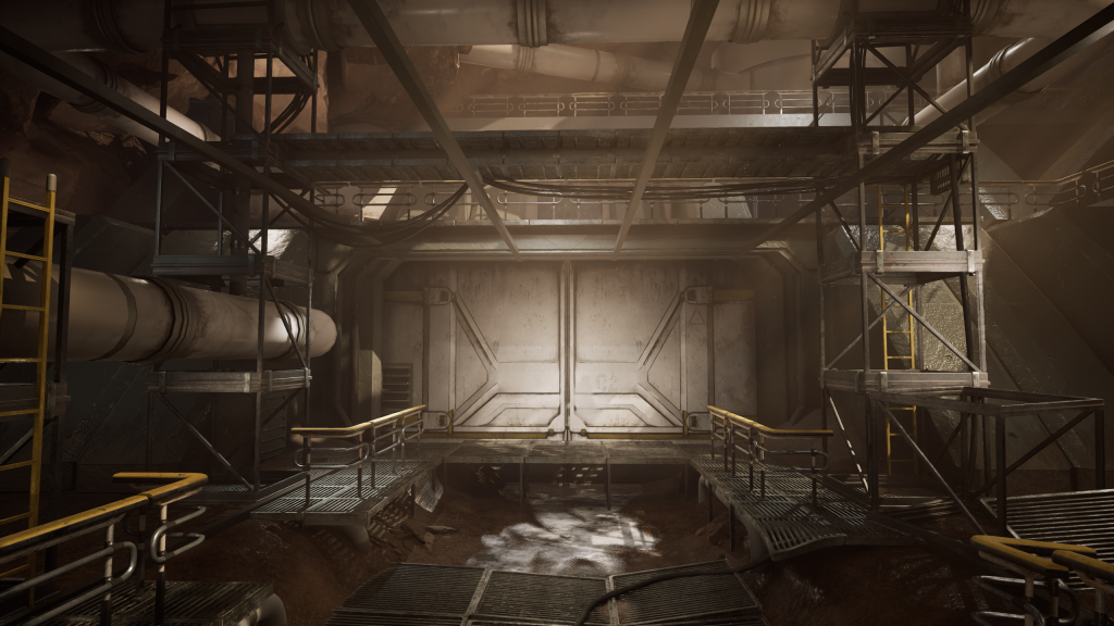 To bring this gritty gateway to life, I prioritized a modular workflow that balanced visual storytelling with technical constraints. I started by blocking out the space to establish a sense of scale and “industrial weight,” ensuring the architecture felt functional like a level the player can walk in rather than a backdrop. By studying games with a similar aesthetic like Titanfall 2, I was better able to determine the integrated industrial elements that gives the station a more factory-like identity. Once the layout was solidified, I focused on creating a high-fidelity camera shot visually.